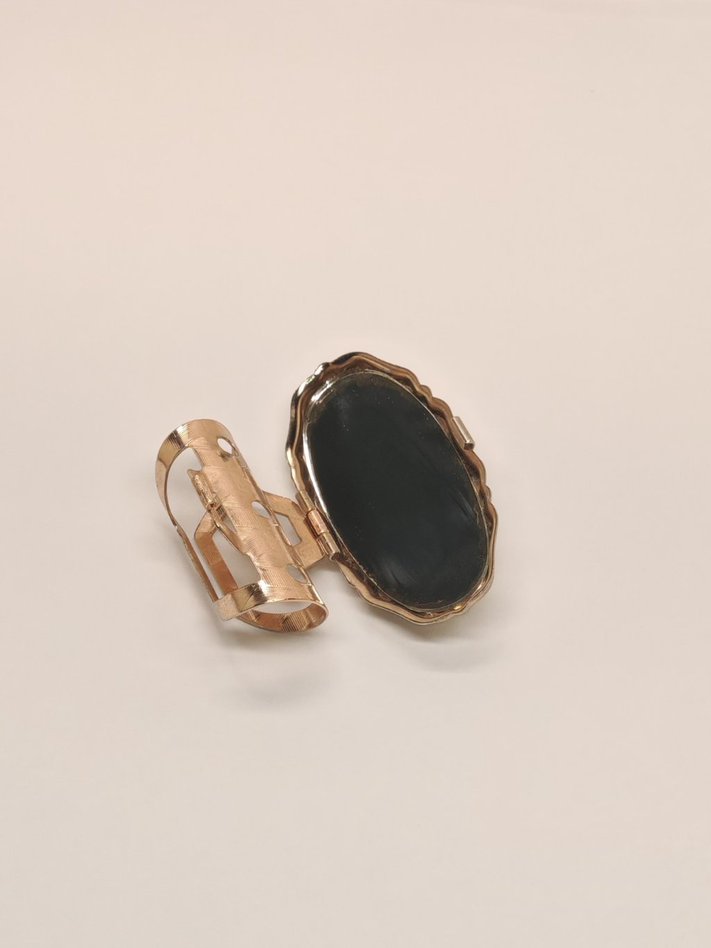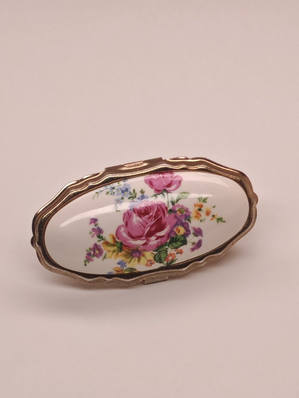 正面採用橢圓形白瓷基底,手繪粉紫色玫瑰花卉紋,搭配金屬波浪紋,里部有鏡子