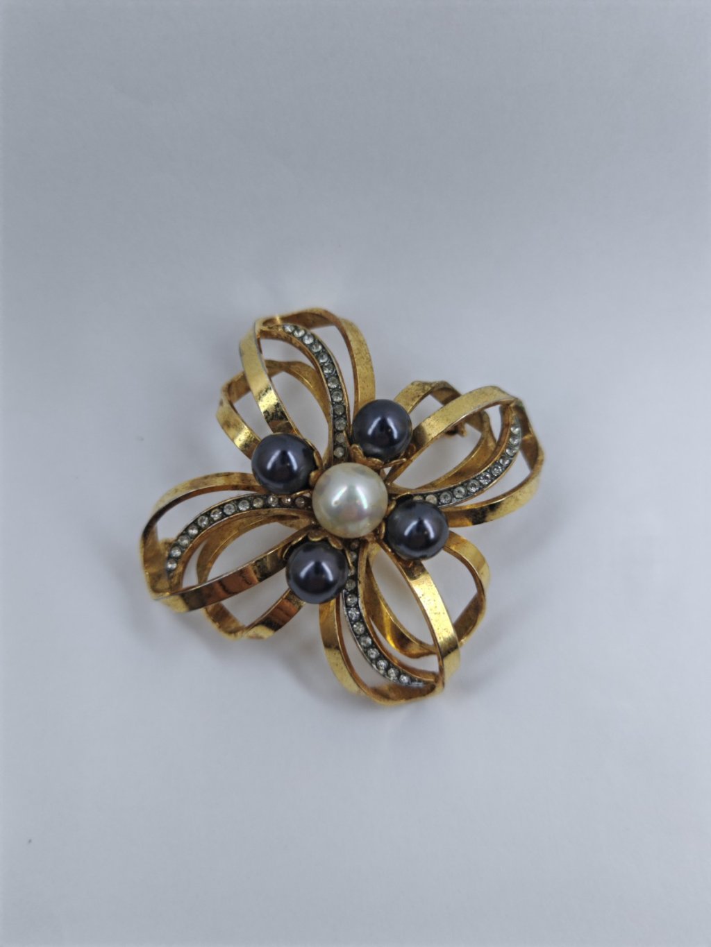 螺旋緞帶造型,白珍珠+黑珍珠撞色,滿鑽鑲嵌,復古金質感