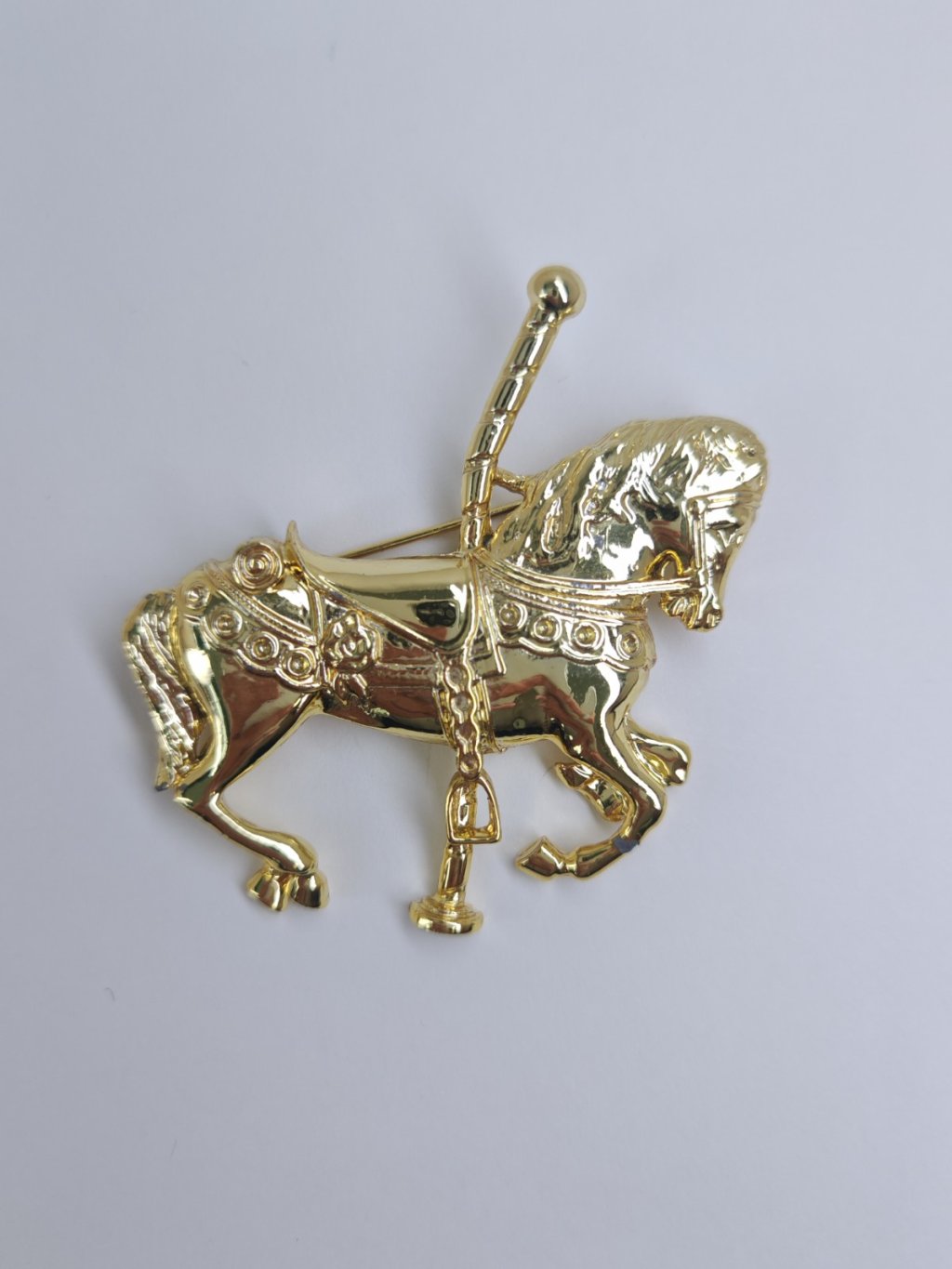 亮面復古金立體旋轉木馬造型,馬鬃、馬鞍紋路雕刻細膩,鏈條裝飾細節精緻,鏡面拋光質感,童趣感拉滿