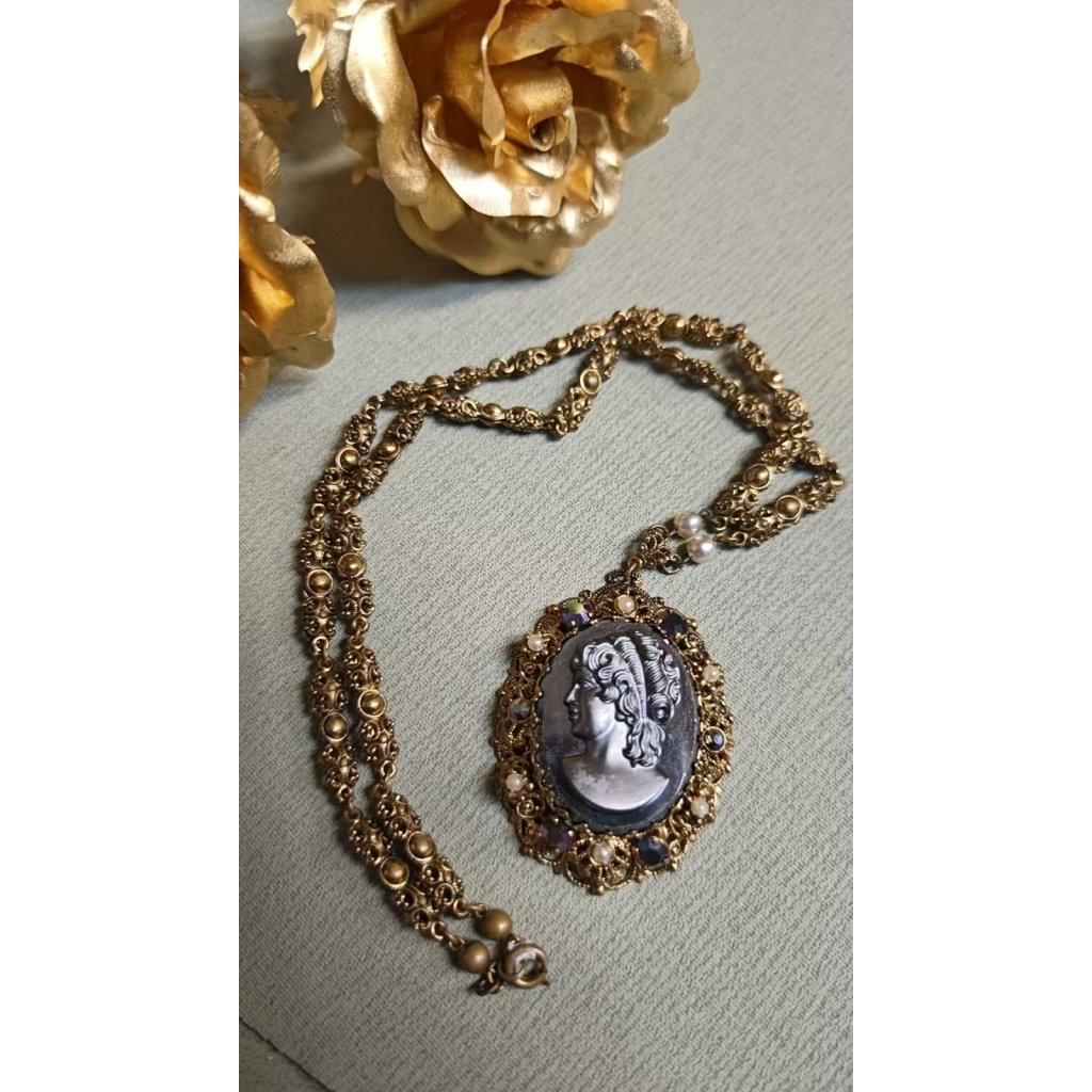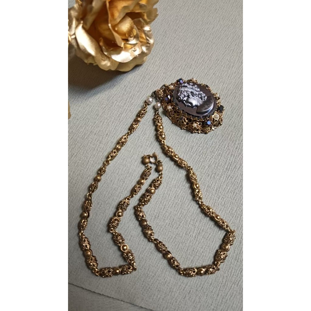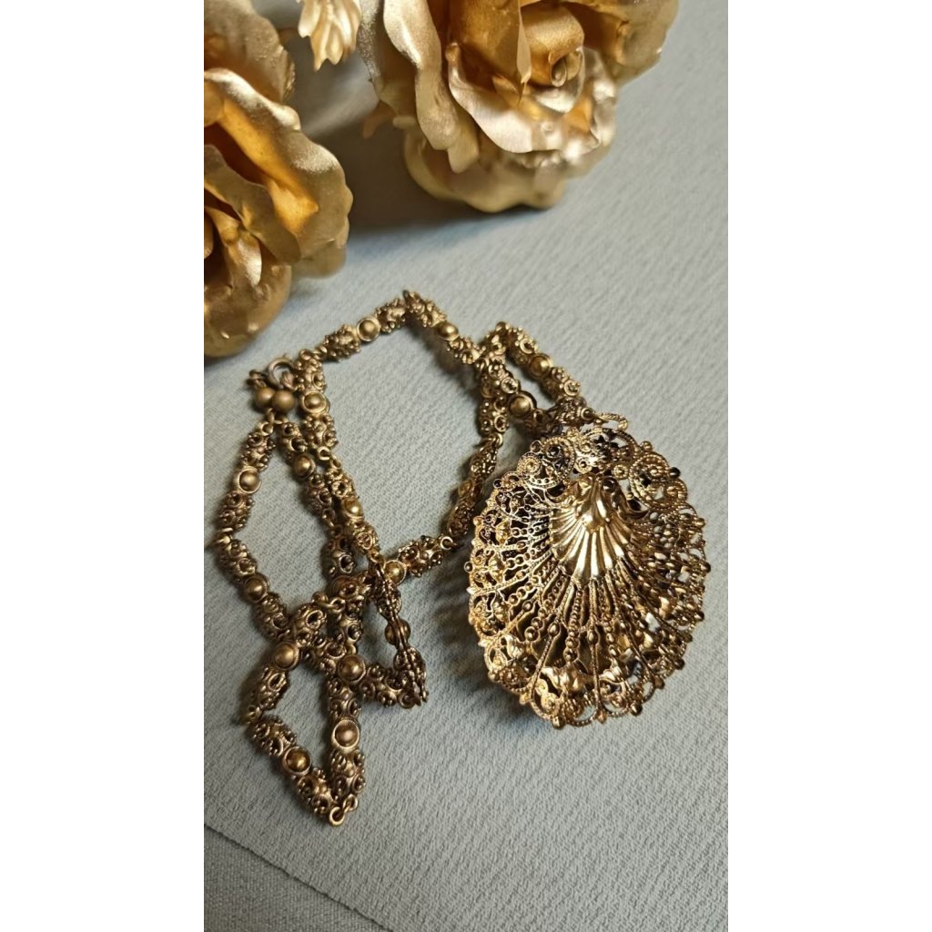 主體貝殼雕刻,底為樹脂琥珀,邊框為合金西德掐絲工藝,鑲嵌釉彩玻璃珍珠